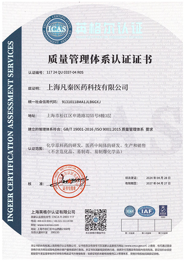 公司还拥有具备良好资质的合作工厂,结合专业的工艺放大生产团队,形成了从小试、中试到工业化规模的生产能力,并且通过ISO9001质量认证,全方位满足客户定制合成、原料药中间体生产的需求。 Our company also has friend company for large scale manufacture of big quantity products. And have ISO9001 quality certification.